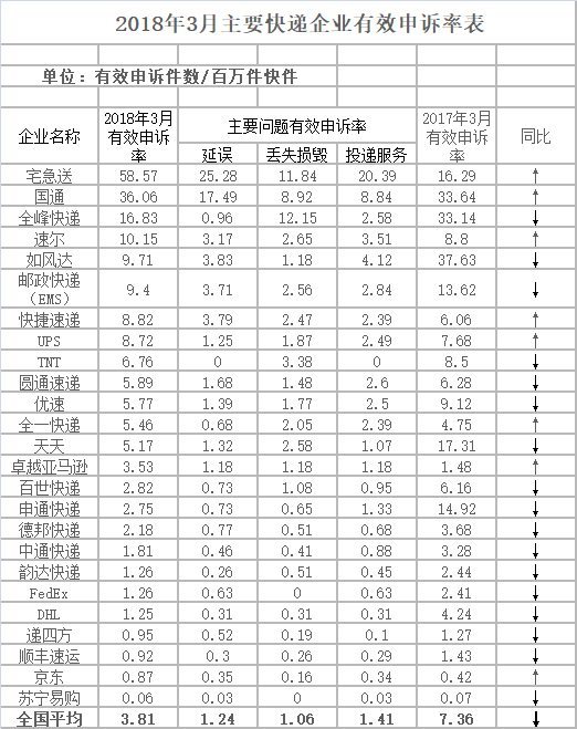 數據顯示,2018年3月,消費者對43家快遞企業進行了有效申訴,全國快遞服務有效申訴率為百萬分之3.81,環比減少2.94,同比減少3.55,高于全國平均有效申訴率的快遞企業有13家。全國快遞服務快件投遞服務的有效申訴率為百萬分之1.41,同比減少1.08;快件延誤的有效申訴率為百萬分之1.24,同比減少1.06;快件丟失損毀的有效申訴率為百萬分之1.06,同比減少1.26。其中,宅急送有效申訴率為58.57,再次位列第一。此前2月份,宅急送以每百萬件有效申訴率56.59,高居榜首位置。