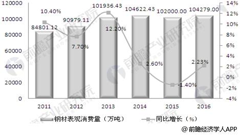 據前瞻產業研究院數據顯示,2011-2016年,除了2015年外,中國鋼材表觀消費量呈現逐年上升態勢,但增幅波動較大。2015年1-12月,我國鋼材表觀消費量累計為10.2億噸,比去年同期下降1.40%。2016年,我國鋼材表觀消費量為104279.00萬噸,同比上漲2.23%。