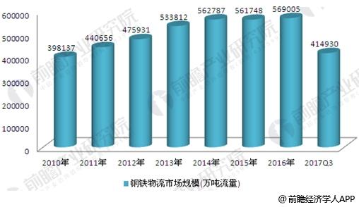 中國是世界上鋼鐵物流規模最大的國家。受益于國家投資拉動內需刺激,中國鋼鐵物流領域物流量巨大。據測算,中國鋼產量與物流量之比約為1:5,即每生產1噸鋼,需要5噸物流量。據前瞻產業研究院發布的《鋼鐵物流行業市場前瞻與投資戰略規劃分析報告》數據顯示,2016年我國鋼鐵物流市場規模約為56.90億噸流量;2017年前三季度約為41.49億噸流量。