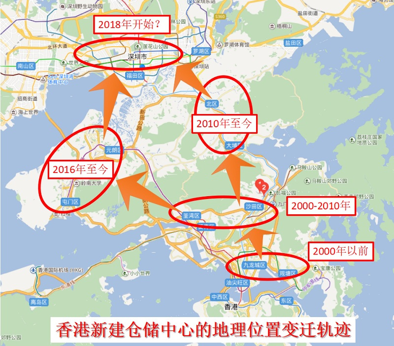 知名地產(chǎn)服務(wù)投資公司——世邦魏理仕發(fā)布報告指出,自2014年以來,香港本地的倉庫空置率長期在0.3%-1%之間浮動,且有逐步走低的趨勢。低空置率直接體現(xiàn)了香港倉儲業(yè)供不應(yīng)求的狀況,并且這種狀況有愈演愈烈的趨勢。對此,世邦魏理仕表示:“長此以往,如果香港倉儲空間仍然十分有限,零售商和物流運(yùn)營商很可能別無選擇,只能搬遷至其他地區(qū),比如香港北面,甚至是深圳”。我們回顧香港倉儲業(yè)過去20年的發(fā)展變遷軌跡,可以發(fā)現(xiàn)這個判斷跟香港新建倉儲中心的地理位置變遷軌跡是相符的,香港大型倉庫的選址,逐漸由港口周邊遷往更“地廣人稀”、更靠近內(nèi)地的北部地區(qū),港口周邊的九龍、觀塘等區(qū)域,則逐漸成為旅游購物的“圣地”。