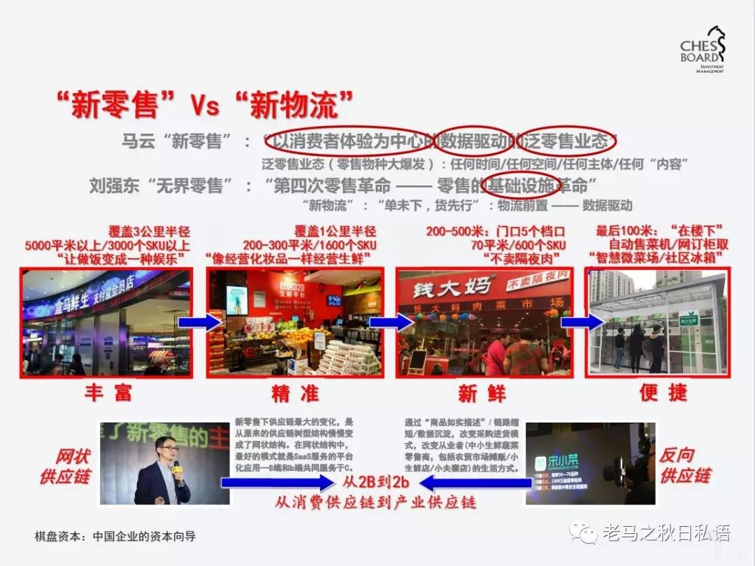 從覆蓋3公里半徑、5000平米以上3000個SKU以上、既是生鮮超市又是飯店還是物流配送中心甚至是消費(fèi)者教育中心“讓做飯變成一種娛樂”的“四不像”“盒馬先生”,到覆蓋1公里半徑、200-300平米1600個SKU、“像經(jīng)營化妝品一樣經(jīng)營生鮮”讓精選食材也都有“身份”都可追溯的“康品匯”,再到離家200-500米、在你家小區(qū)門口5個檔口以內(nèi)、70平米600個SKU、只賣肉和蔬菜和水產(chǎn)堅決“不賣隔夜肉”的“錢大媽”,直至就“在樓下”、網(wǎng)訂柜取的“社區(qū)冰箱”“智慧微菜場”的自動售菜機(jī),這些“新零售”的經(jīng)典案例,清晰地勾勒出一個“數(shù)據(jù)驅(qū)動”的“物流前置”軌跡,所謂“單未下、貨先行”,所謂“樓上下單、樓下送貨”。
