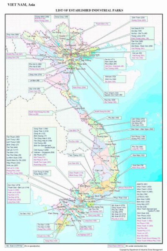 從這張地圖可以看出,越南的工業(yè)園區(qū)從最北端到南端排成一排。 大多數(shù)工業(yè)園區(qū)都分布著從事不同行業(yè)的多樣化企業(yè)。