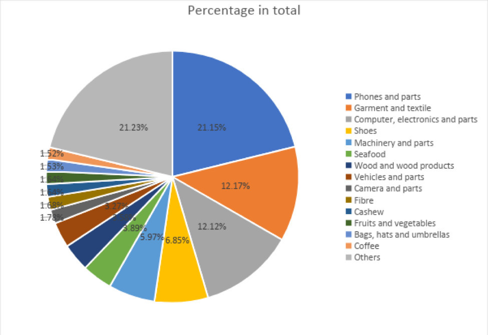 越南出口品類繁多。 依照商品總價值來看,電話、電腦和電子產(chǎn)品,以及服飾鞋履是越南出口最多的商品。(來源:越南統(tǒng)計總局)
