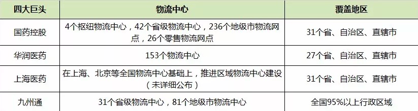 近日,九州通發布2017年年報,據其年報顯示,2017年九州通實現營業收入739.43億元,比上年同期增加20.12%,截至2017年底,九州通已在全國先后投資布局了112個醫藥物流配送中心,而國藥、華潤、上藥等流通行業巨頭也都在全國擁有強大的分銷網絡。