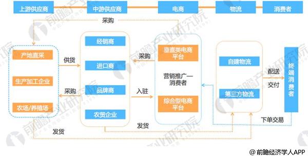 從生鮮電商產(chǎn)業(yè)鏈來看,上游為蔬菜水果等供應(yīng)商,下游為消費(fèi)者,物流方面為自建式和第三方物流。產(chǎn)品和物流為生鮮電商核心要素。
