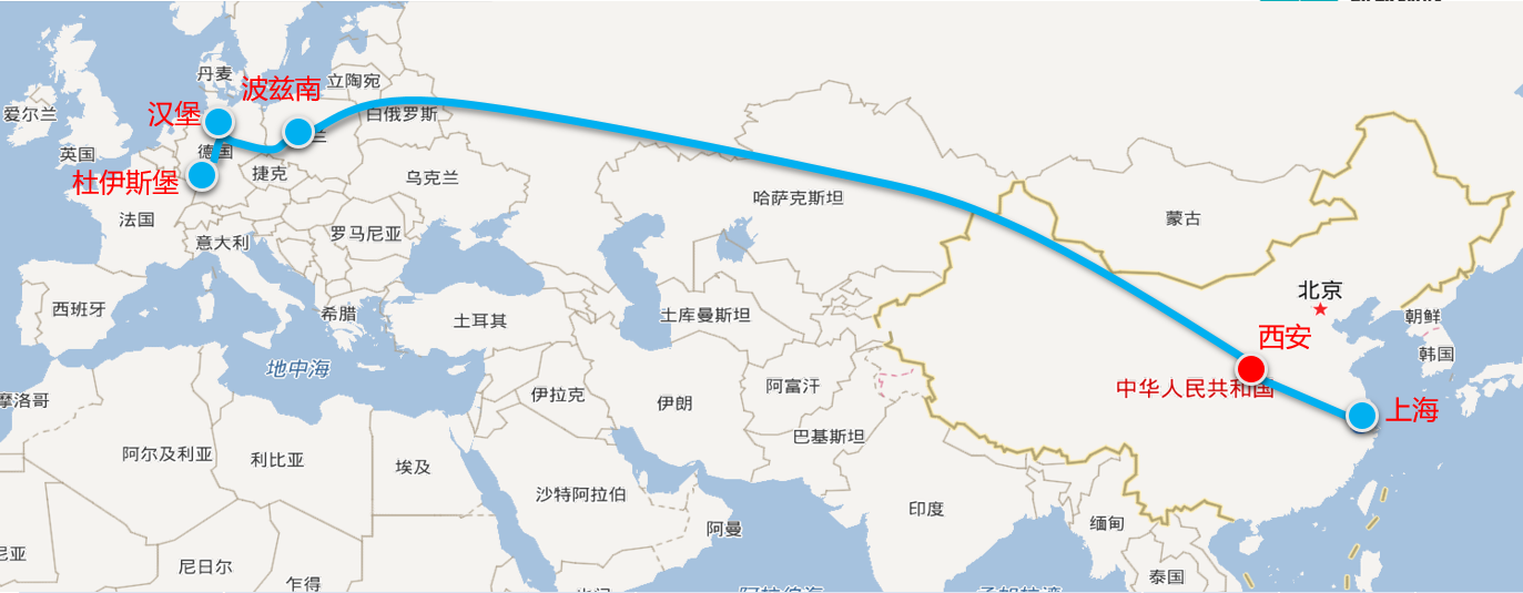 由傳化智聯與凱晟物流共同打造的這趟中歐班列,始發于中國上海,在西安中轉,經新疆阿拉山口出境,過哈薩克斯坦、俄羅斯、白俄羅斯、波蘭,最后到達終點德國杜伊斯堡,全長11000公里,全程20至22天,每周開行1列。