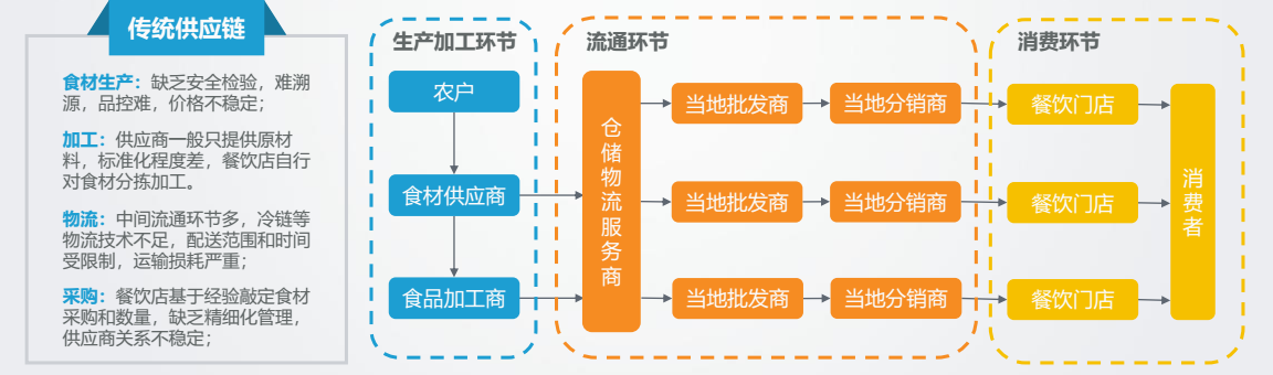 餐飲行業的采購是一個高頻的剛性需求,前端盡顯繁華,后端卻依舊保持著傳統的供應鏈模式(如下圖所示)。可是傳統餐飲業要經過采購商、原料加工廠、食品加工廠以及無數分銷商、零售商等諸多環節,傳統的供應鏈市場小而分散,中間的損耗嚴重,品控很難把握,在這個傳統鏈路里,隨時隨地隨處都可能充斥著不透明、不確定,餐飲業對專業的供應商需求愈加的強勁。若想整合餐飲供應鏈,就必須深入了解整個供應鏈的架構,兵家云,知己知彼,百戰不殆。餐飲供應鏈橫跨多方,每個環節的力量都是龐大而混沌的,想要打通整個供應鏈就要要理解各方的力量,否則只會是管中窺豹。