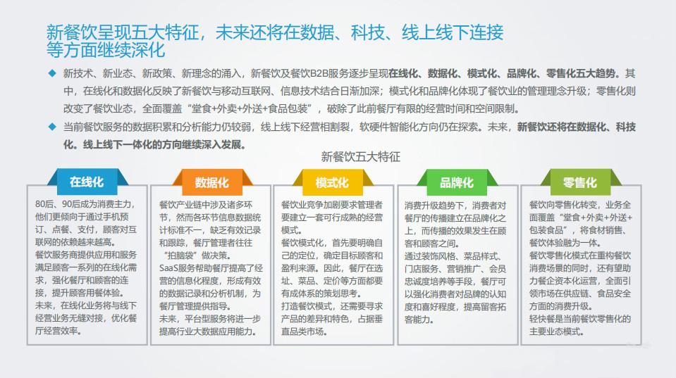 巨大的市場容量,加上“不成熟”的傳統食材供應方式,從嚴格意義上說,餐飲B2B這是一塊足夠誘人的蛋糕。加之在新餐飲(如下圖所示)的驅動下,給了餐飲業新一輪轉型升級的思路,餐飲企業皆有“換道超車”的機會,是否能夠提前布局、打通供應鏈、與各個環節的玩家共贏,重構“人、貨、場”,將決定餐飲電商的發展。