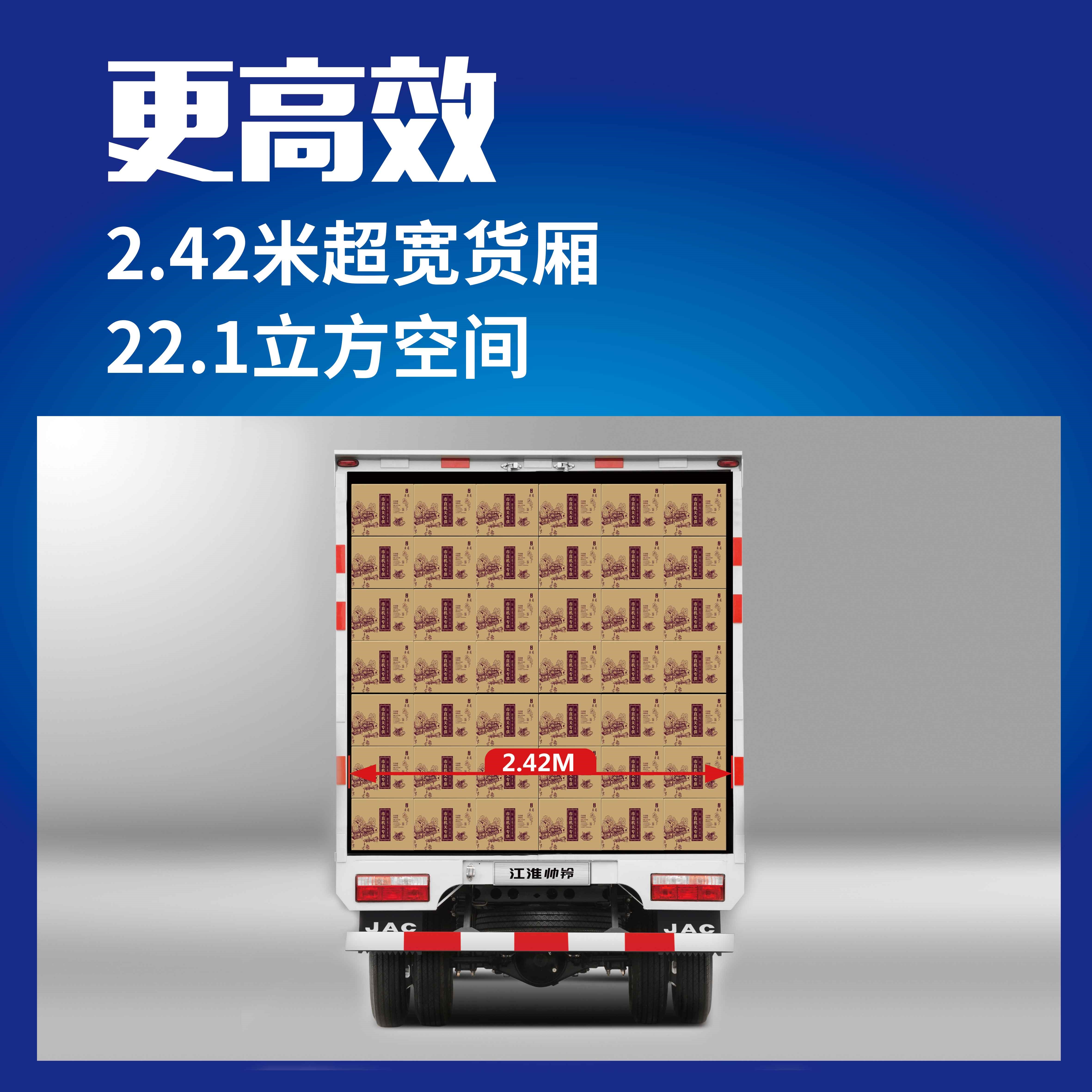 帥鈴全能物流版獨有的2.42米超寬貨廂讓貨廂容積達到22.1立方,在物流旺季輕松滿足超大運輸空間的需求,兩車貨物一車拉,可并排放置兩個1.2米標準托盤,整車最多同時裝載8個標準托盤,實現專業物流高效運輸。