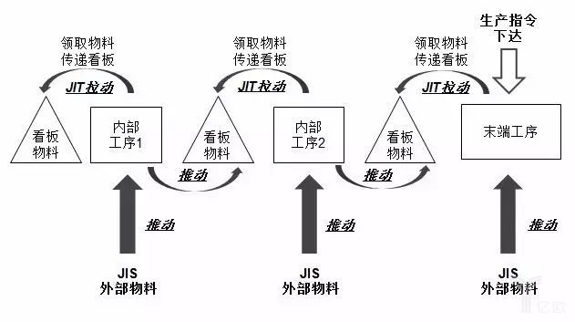 眾所周知,豐田的零庫存是通過“JIT-Just In Time”和“看板Kanban”結(jié)合的管理模式來實現(xiàn)的。“JIT”和“看板Kanban”模式是典型的需求拉動模式。JIT-Justin Time準時制生產(chǎn)方式,即只在需要的時候提取所需要的數(shù)量,而這個所需要的數(shù)量是通過看板Kanban來實現(xiàn)的。