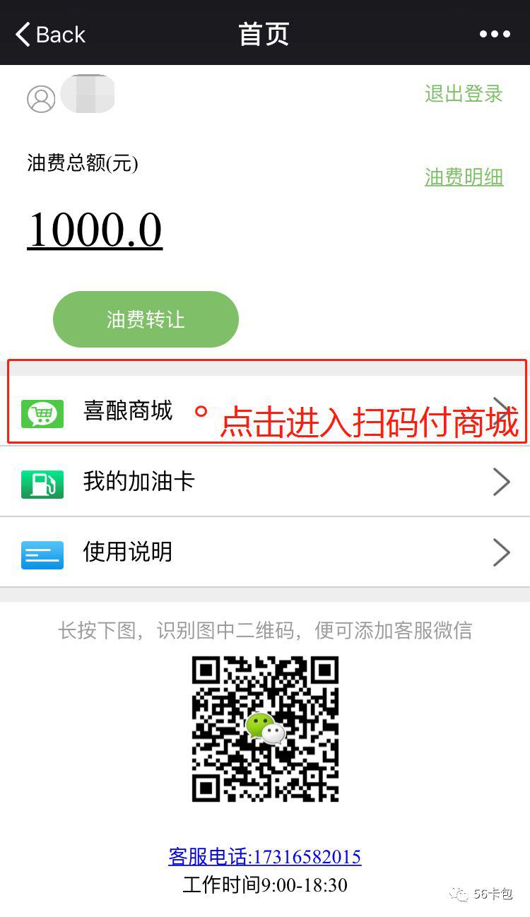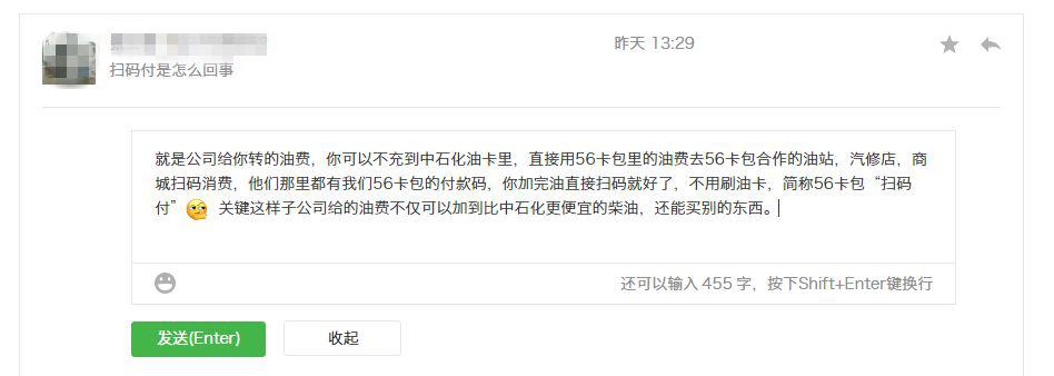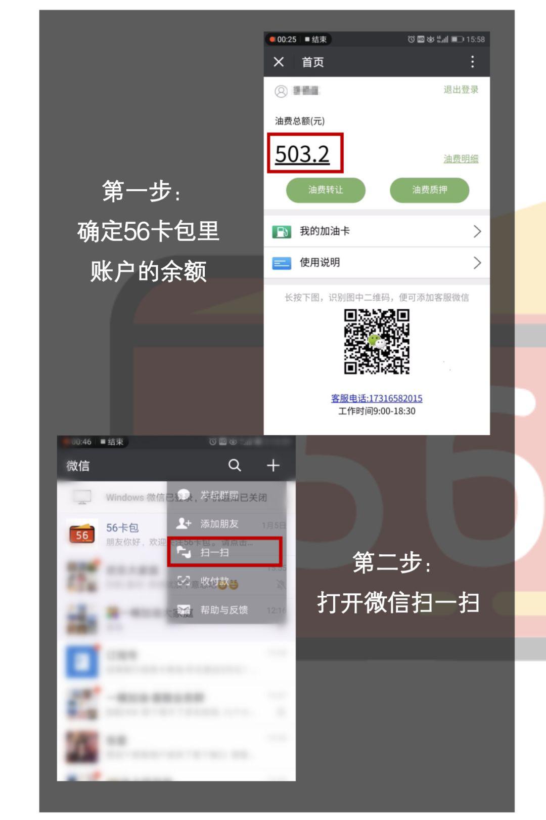 就是公司給你轉的油費,你可以不充到中石化油卡里,直接用56卡包里的油費去56卡包合作的油站,汽修店,商城掃碼消費,他們那里都有我們56卡包的付款碼,你加完油直接掃碼就好了,不用刷油卡,簡稱56卡包“掃碼付”。