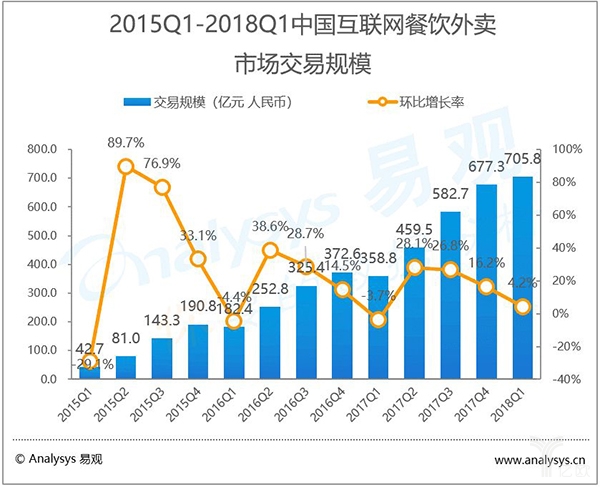從上圖可以看出,最近三年,外賣市場(chǎng)交易環(huán)比增長(zhǎng)率最高達(dá)89.7%。但自從2017年Q2季度以來,交易規(guī)模增速持續(xù)下降,到了2018年Q1季度只有4.2%的增長(zhǎng)率,與2015年Q2季度相比,增速降低了近20倍。隨著外賣行業(yè)滲透率不斷增加,新業(yè)務(wù)增長(zhǎng)點(diǎn)開拓乏力,外賣行業(yè)增速趨緩,對(duì)于外賣人員的需求增量也隨之減少。