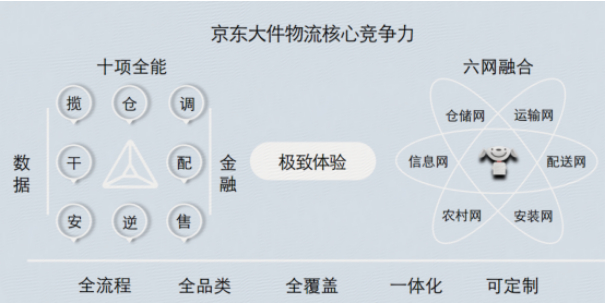 京東物流基礎(chǔ)設(shè)施面積超過1000萬平方米, 已成為全國擁有最大規(guī)模基礎(chǔ)設(shè)施的物流企業(yè)。近年來,京東物流大力布局大件網(wǎng)絡(luò),目前已覆蓋大陸所有行政區(qū)縣,近60萬行政村。基于倉儲(chǔ)、配送等能力,京東物流打造了倉、運(yùn)、配、調(diào)撥、安裝、逆向等十項(xiàng)全能服務(wù)。