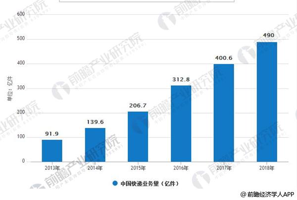 據前瞻產業研究院發布的《快遞行業發展趨勢與投資規劃分析報告》數據顯示,近年來,國內快遞量快速增長,從2013年的91.9億件增長至2016年的312.8億件,漲幅達340.4%。2017年,全國快遞業務量達400.6億件。按照我國快遞業務不斷增長態勢,預計到2018年中國快遞業務量將近500億件。