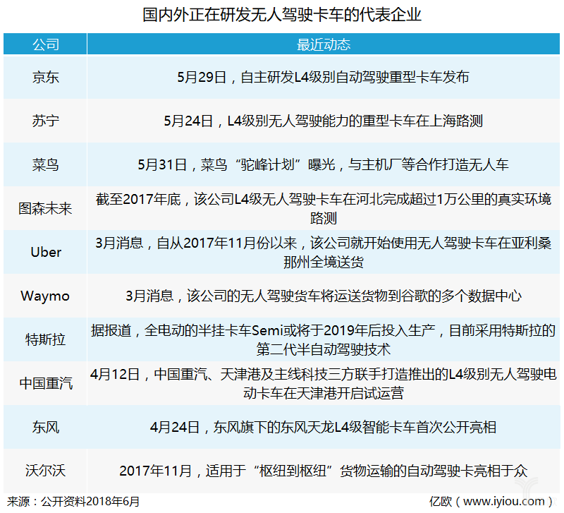 相比較私人駕車的自動駕駛,在貨運、物流方面或許將更快實現商業化運作。在可預測性高的貨運干線路段或者封閉性貨運場景,將是無人駕駛率先落地的優先場景。當前,在無人駕駛卡車領域,主要有電商物流企業、新創造車企業、傳統主機廠三類企業入局。