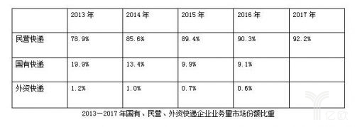 民營快遞企業已然成為我國快遞業的支柱,國有及外資快遞企業與民營快遞企業已經沒有可比性。在這種背景下,2017年的郵政行業發展公報中沒有再提及國有及外資快遞企業的市場份額,更加印證了這一結論。