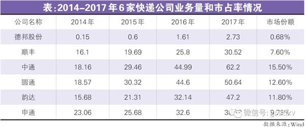 2014-2017年6家快遞公司業(yè)務(wù)量和市占率情況