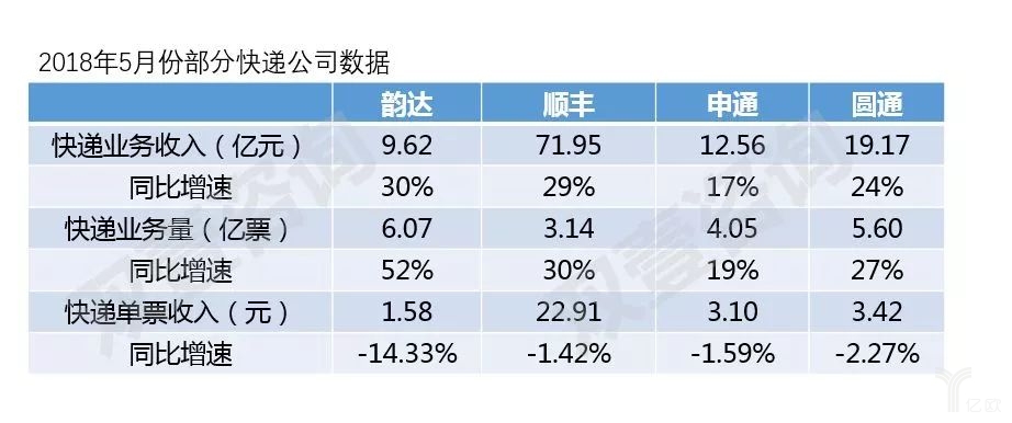 值得一提的是,韻達不僅單票收入下降幅度最陡,同時業績增長最快,業務量、市占份額、凈利潤等指標增速,已遠超行業平均水平。韻達在2018年1-4月單票收入分別為2.01元、2.06元、1.76元和1.66元,同比、環比降幅遠大于行業平均水平。同時韻達第一季度實現4.04億元的凈利潤,同比增長幅度達44.74%,業務量同比增長高達51.75%至6.07億,市場份額也從年初11.8%增長至目前14.7%。