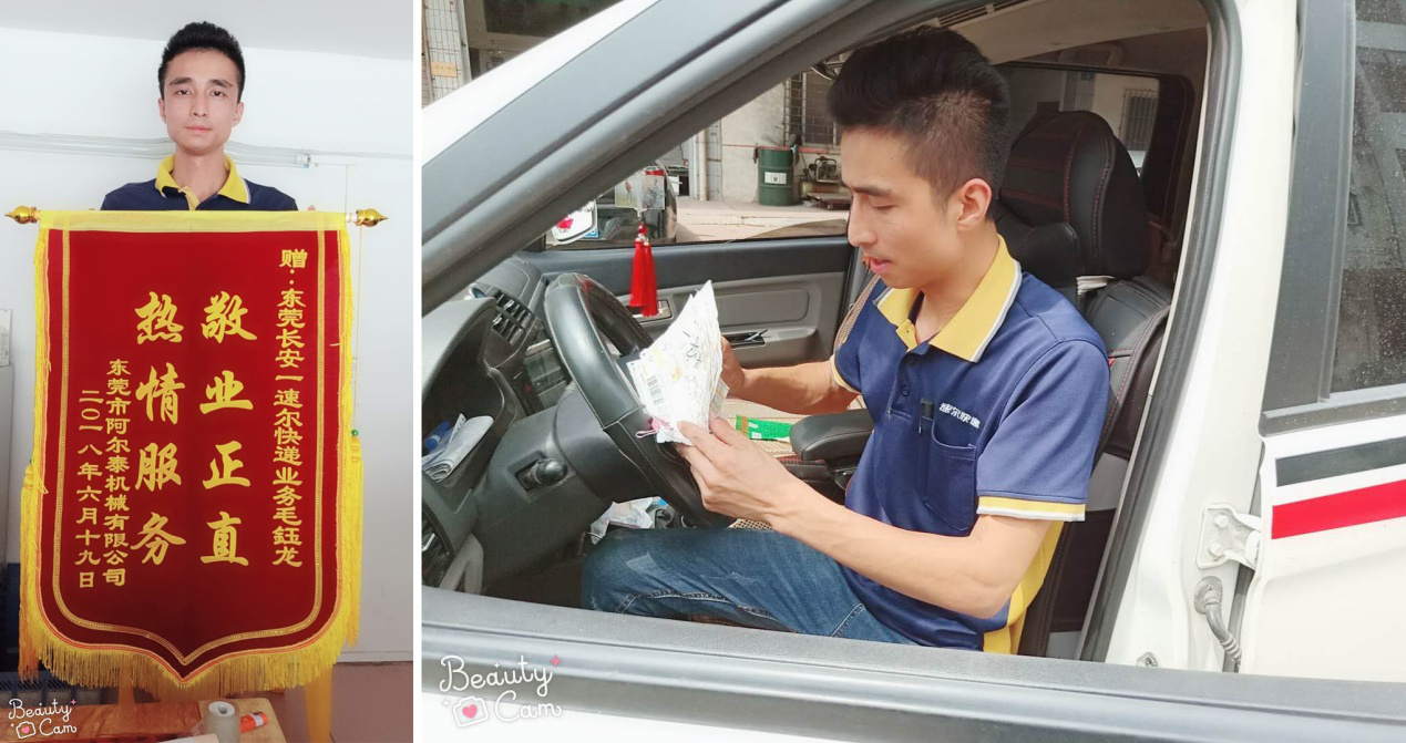 東莞市阿爾泰機械有限公司是贈送錦旗給毛鈺龍的企業客戶,在這家企業中,無論是領導還是收發貨人員,對于毛鈺龍的評價都很高,但毛鈺龍沒進入速爾前,這家企業并非是和速爾快遞合作。“之前我們公司發貨用的是一家價格更為便宜的快遞公司,后來毛鈺龍來速爾上班給我們派件,每次都是面帶微笑,有時候會有代收貨款的快件,我們收件時間會久一些,他也不會有急躁不耐煩的表情,總是溫和很有耐心,這給我的印象很深,而且每次過來都和我主動打招呼,有時候我有急件需要他早點送過來,不管刮風下雨他都會按約定的時間送到,記得好多次我不在公司讓他幫我送到住的地方,他也每次都送過去,慢慢地我們就像朋友一樣了,我覺得他人真的很好,所以選擇了他。” 該公司業務經理曹先生說道。