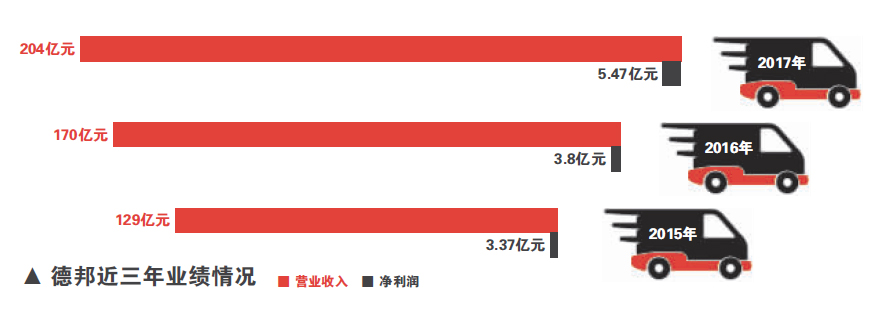 數據顯示,德邦2017年業務件量3.13億票,營業收入為203.5億元。其中,快運收入2017年為129.94億元,同比增長2.93%;快遞業務收入69.28億元,同比增長69.14%,高于快遞行業整體收入增速。