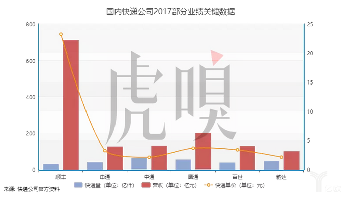 各家快遞的營收業務數據也可以印證這句段子:在2017年內,順豐一共營收了711億元,比“四通一達”加起來都多,但同時順豐全年的快遞單量卻又是這6家公司中最少的。經過簡單的除法計算可知,順豐的單次快遞收入為23.29元,相比其它公司的數目,順豐足足高出6~11倍。