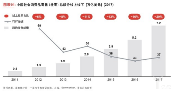 2017年中國網(wǎng)絡(luò)零售市場交易規(guī)模約為7.2萬億元人民幣,同比增速約37%,相較于2015年的約38%、2013年的約43%及2011年約69%,電商增速連續(xù)放緩,出現(xiàn)行業(yè)性趨緩態(tài)勢,這意味著中國電商依靠流量紅利獲得持續(xù)性高速增長已非易事,預(yù)計未來將過渡到每年約20-30%的復(fù)合增長速度。