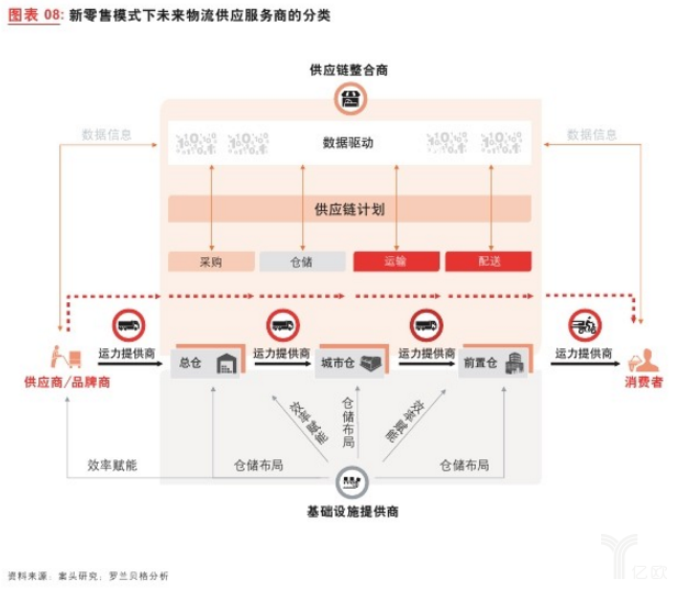 三類玩家將在新零售下的供應(yīng)鏈環(huán)節(jié)中各自承擔(dān)更為清晰的任務(wù)分工。首先,供應(yīng)鏈整合商在前端與消費者距離最近,在數(shù)據(jù)抓取上具備天然優(yōu)勢,可以提供準確且具前瞻性的供應(yīng)鏈計劃,同時對接后端供應(yīng)鏈各物流執(zhí)行環(huán)節(jié)的利益相關(guān)方并提供指導(dǎo)。進而,運力供應(yīng)商逐步回歸自身在運輸、倉儲及物流科技應(yīng)用環(huán)節(jié)上的專長,聚焦物流運營效率的提升。