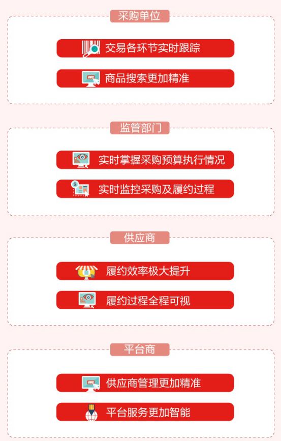 除此之外,通過該平臺中小供應商可以享受到物流、金融服務,降低了采購方與供應商組織政府采購活動的成本;對于軟件供應商而言,可以更清晰地了解政府需求,延伸對政府采購的服務路徑和服務內容。