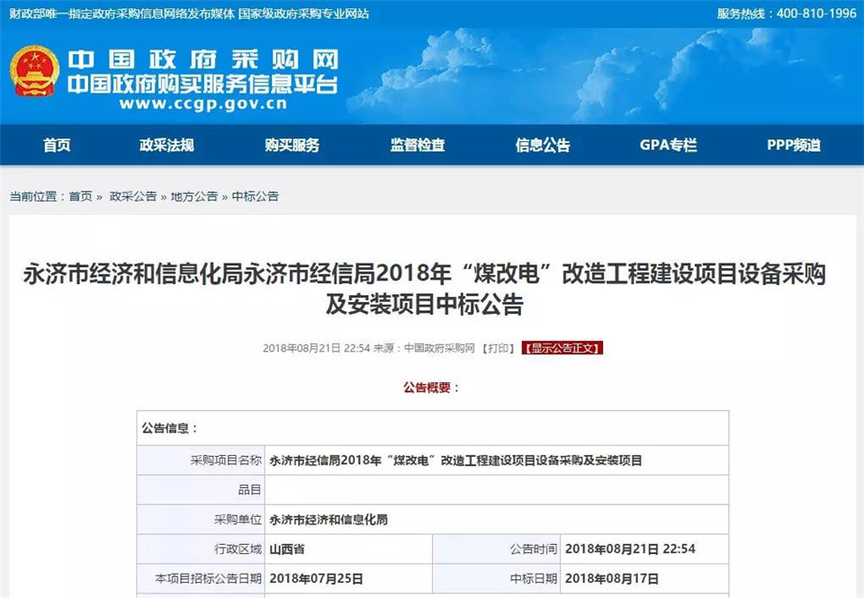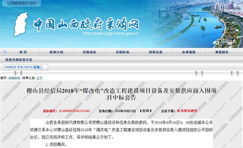 中國政府采購網發(fā)布《永濟市經信局2018年“煤改電”改造工程建設項目設備采購及安裝項目中標公告》。中國山西政府采購網發(fā)布《稷山縣經信局2018年“煤改電”改造工程建設項目設備及安裝供應商入圍項目中標公告》。