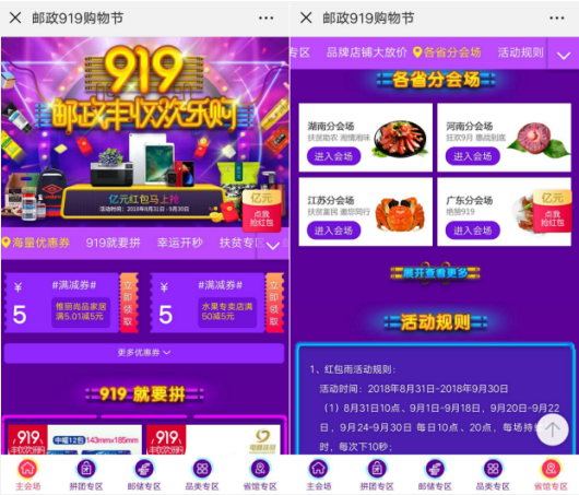 本屆主題定為“郵政919,豐收歡樂購”,活動期間將聚焦,推出一系列便農、利農、惠農的活動措施;同時,“郵樂”APP上也將推出一系列優惠大促活動,包括海量優惠券、919就要拼、幸運開秒、扶貧專區、郵儲銀行、郵品專區、品牌店鋪大放價等專區,涵蓋衣食住行全方面,為廣大老百姓提供便捷的“線下體驗+線上網購”的綜合性服務。