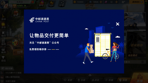 雙方達成合作后,中郵速遞易的智能快遞柜和小黃筒等智能終端將從現實世界中的生活基礎設施,化身成為《王牌戰爭》中的場景道具在虛擬游戲世界中呈現。玩家們不僅可以在游戲世界中遇到熟悉的智能終端設備,還可以進入中郵速遞易公眾號領取《王牌戰爭》專屬禮券以及免費代存券等福利。