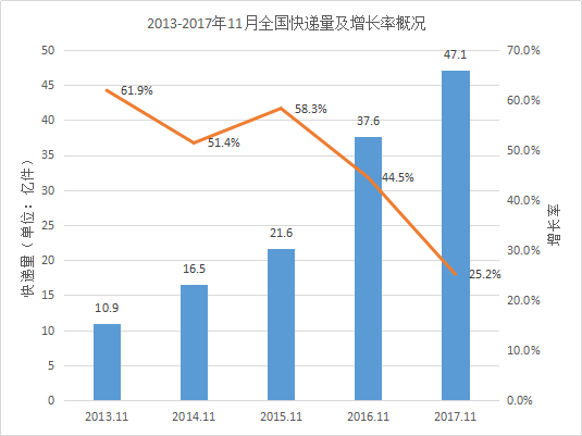 近年來,我國快遞數量可謂“沒有最高,只有更高”,而每年的“雙11”快遞量更是驚人?;仡?013年~2017年11月快遞量數據:2013年11月10.9億件,2014年11月達16.5億件,2015年11月達21.6億件,2016年11月達37.6億件,2017年11月達47.1億件。