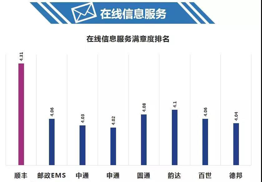 除了線下服務,線上服務體驗也在影響著消費者的滿意度,此次在線信息服務,綜合考慮快遞公司在線查詢的便捷性、全程信息推送、時效預估準確度等信息上消費者的滿意度。