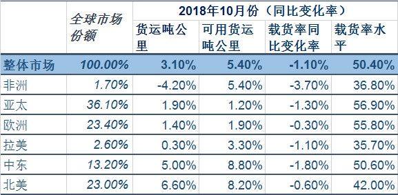 2018年10月份,除非洲以外,其他各地區(qū)航空公司貨運(yùn)需求均實(shí)現(xiàn)同比增長(zhǎng)。