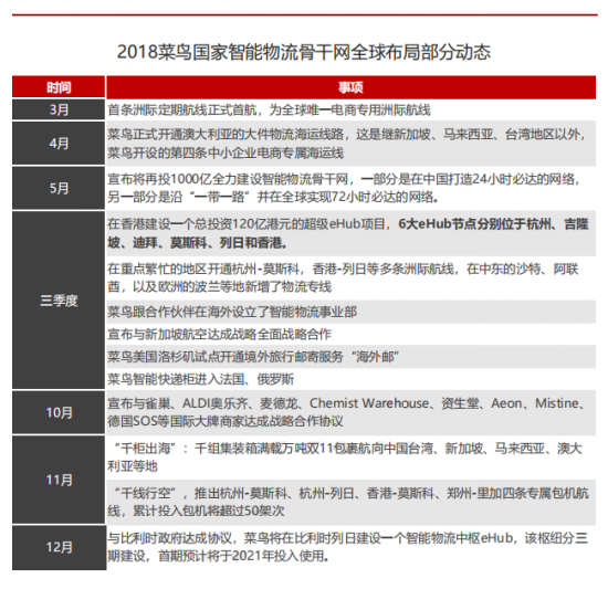 今年5月,馬云宣布將投資上千億打造全球智能物流骨干網。目前,菜鳥已在杭州、香港、吉隆坡、迪拜、列日、莫斯科等城市設立首批6個eHub(電子商務樞紐),截至2018年12月,菜鳥eWTP已落地馬來西亞、盧旺達、比利時三站,菜鳥全球布局效應明顯。