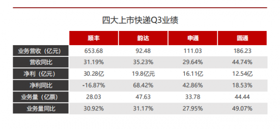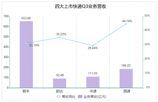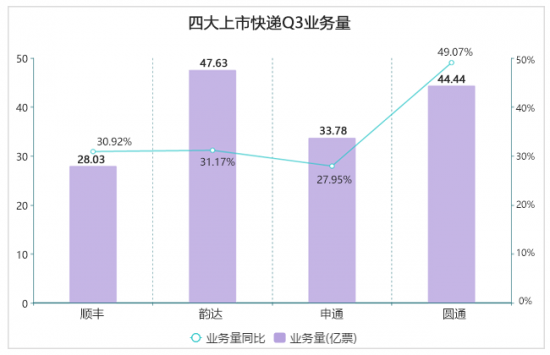 根據中國郵政局公布的《關于2018年前三季度郵政行業經濟運行環境的傳遞》,2018年前三季度,全國快遞營業量完成347.4億件,同比增加26.8%;快遞營業收入實現4246.3億元,同比增加24%。順豐、韻達、圓通、申通四大快遞股前三季度合計實現營業量153.88億件,占全國總營業量的44.3%。
