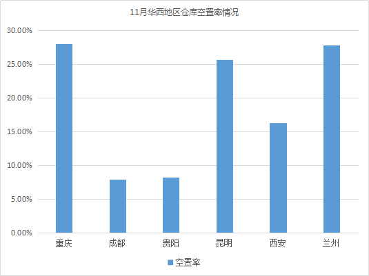 全國(guó)30個(gè)城市倉(cāng)庫(kù)平均空置率為10.43%,環(huán)比下降0.18%,其中,華西地區(qū)倉(cāng)庫(kù)空置率要顯著高于其他四個(gè)大區(qū)。相較10月,華南、華北地區(qū)倉(cāng)庫(kù)空置率有小幅上漲,華東、華中、華西地區(qū)倉(cāng)庫(kù)空置率有小幅下降。