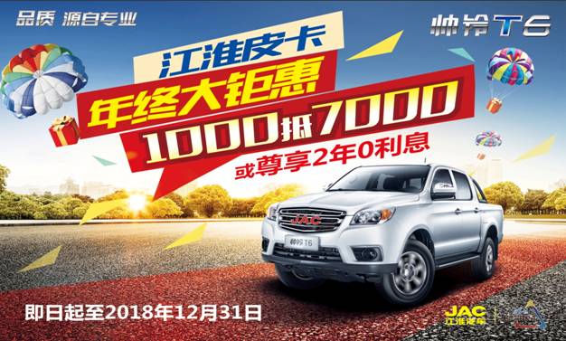 從即日起到12月31日,江淮皮卡年終感恩大回饋,凡購買帥鈴T6全系皮卡即享受交1000元抵7000元年終鉅惠,妥妥的幫你節省一大筆開支。看到如此令人興奮的優惠活動,您是否已經按奈不住?江淮皮卡告訴您,選擇不止一種,需要購車貸款的用戶還能選擇3成首付2年零利息的優惠活動,幫您節省近萬元開支,購車從此不再是壓力。