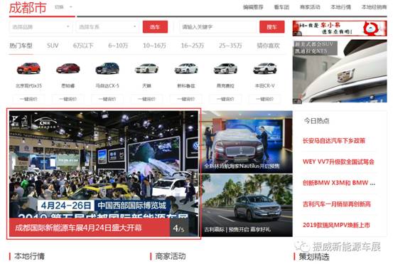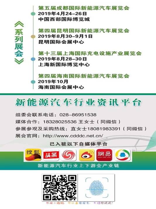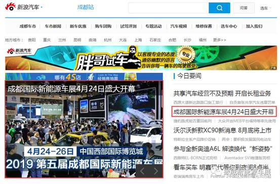 2019年4月24-26日,由振威展覽股份主辦的第五屆成都國際新能源車展將在中國西部國際博覽城召開。據成都國際新能源車展組委會相關負責人介紹,騰訊、新浪、網易、太平洋汽車、中國新能源汽車網、四川省電視臺、成都市電視臺、成都交通臺等100多家媒體將會派出專業視頻新聞記者團體奔赴展會現場,對本次參展企業的新車發布、技術演講、產品體驗、高峰論壇等活動進行全方位宣傳報道。