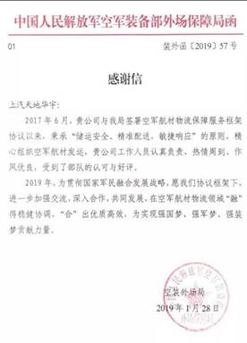 直到2017年6月,第一個“軍民融合”項目達成了合作。天地華宇就與空軍裝備部場外局簽署了空軍航材物流保障服務框架協議,戰略合作為期3年。并于2019年1月空軍裝備部外場保障局發來感謝信,受到了部隊的認可與好評。
