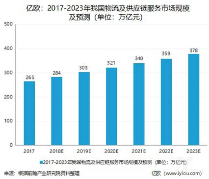 當前,供應鏈市場迎來歷史發展的重要機遇期,根據前瞻產業研究院發布的《2018-2023年中國供應鏈管理服務行業市場前瞻與商業模式分析報告》顯示,未來五年我國物流及供應鏈服務市場價值復合增長率將保持在10%左右,到2020年我國物流及供應鏈服務市場價值將達到321萬億元,到2023年,市場價值有望達到378萬億元。
