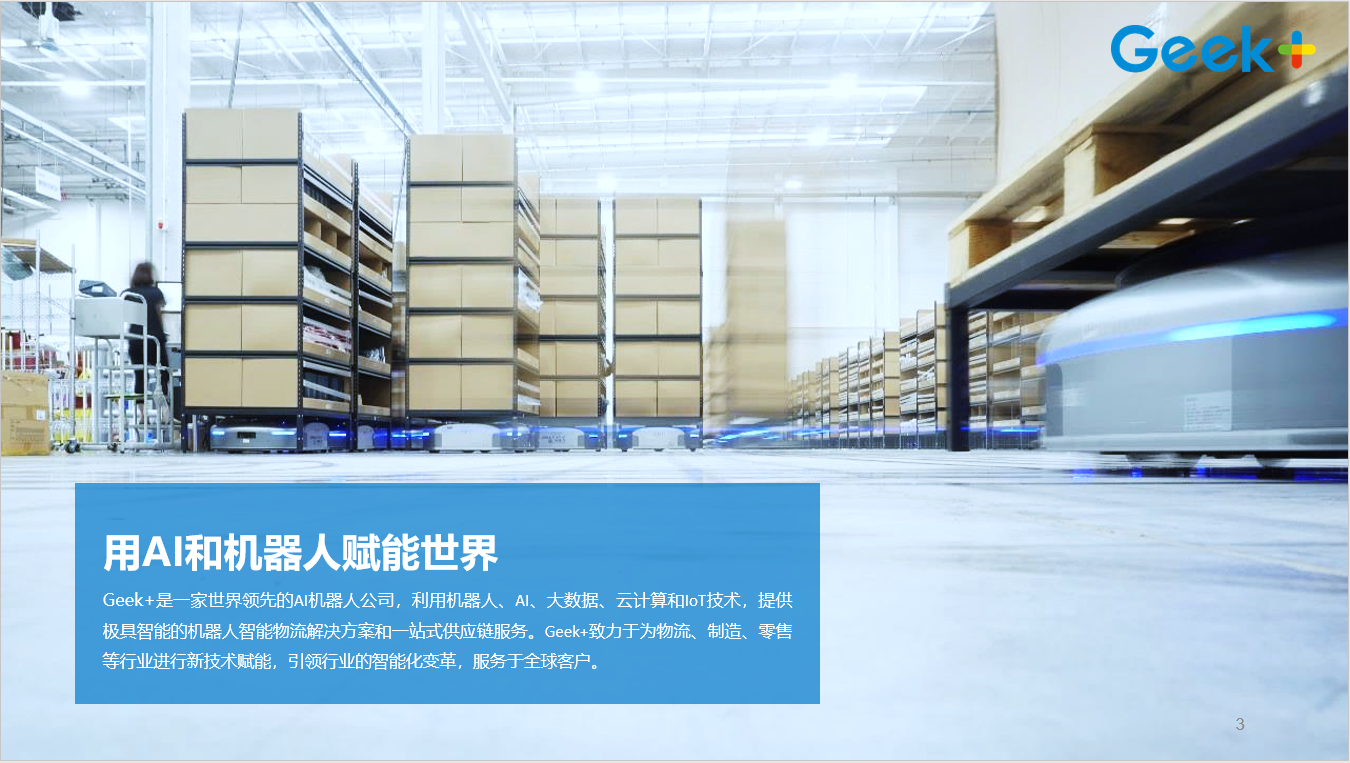 Geek+是一家行業(yè)領(lǐng)先的AI機(jī)器人公司,利用機(jī)器人、AI、大數(shù)據(jù)、云計(jì)算和IoT技術(shù),提供極具智能的機(jī)器人智能物流解決方案和一站式供應(yīng)鏈服務(wù)。Geek+致力于為物流、制造、零售等行業(yè)進(jìn)行新技術(shù)賦能,引領(lǐng)行業(yè)的智能化變革,服務(wù)于全球客戶。