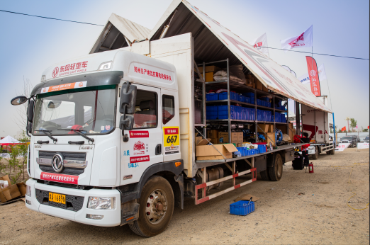 5月31日,在2019年環塔拉力賽后勤保障營地,兩臺造型奇特的龐然大物吸引了不少環塔拉力賽觀眾的目光。身著特殊涂裝,一聲令下便可變身為“移動工廠”的東風多利卡D12,再次作為此次環塔拉力賽上奪冠頭號種子選手——鄭州日產車隊的唯一指定后勤保障車,全程為鄭州日產車隊提供貼身保姆式護航。