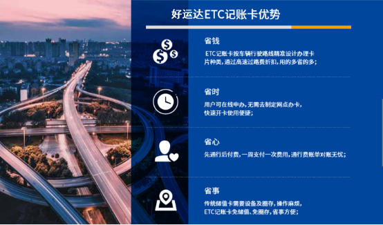 傳統儲值卡需要設備及圈存,操作麻煩。ETC記賬卡免儲值、免圈存,省事方便。先通行,后付費,緩解用戶資金壓力,保障資金安全。通過高速過路費折扣,保證用戶用的多省的多。用戶可以方便的從儲值卡向記賬卡過渡。另外,在財務結算和數據管理方面,ETC記賬卡可聯網記錄車輛的交易數據,后期進行數據分析后實現路徑優化,提高運輸時效;還能實時查詢車輛動態,準確記錄通行及履約數據,提升財務管理效率和資金周轉率。