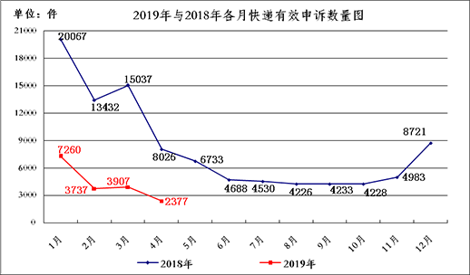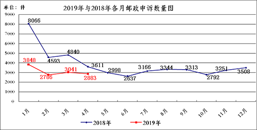 2019年4月,國家郵政局和各?。▍^、市)郵政管理局通過“12305”郵政行業消費者申訴電話和申訴網站共處理消費者申訴54684件。申訴中涉及郵政服務問題的2883件,占總申訴量的5.3%;涉及快遞服務問題的51801件,占總申訴量的94.7%。