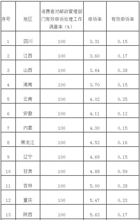 郵政業消費者對各省(區、市)郵政管理部門有效申訴處理工作滿意率(郵政業消費者對郵政管理部門有效申訴處理工作滿意件數與郵政管理部門結案有效申訴總量之比)為98.7%,低于全國平均有效申訴處理滿意率的地區有8個;各?。▍^、市)快遞服務申訴率(所在省份快遞企業每百萬件收投業務量中發生申訴問題的件數)為5.43,高于全國平均申訴率的地區有19個。