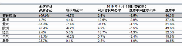 亞太、歐洲和中東地區貨運量急劇下滑,而非洲、拉美和北美地區2019年4月份貨運量實現小幅增長。