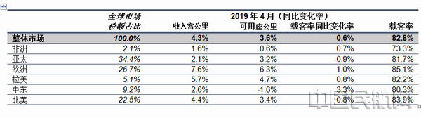 2019年4月份,全球航空客運需求(按照收入客公里計算)同比增長4.3%。4月份,客運運力(按照可用座公里計算)增長3.6%,載客率上升0.6個百分點,達到82.8%,超過去年同期水平(82.2%)。非洲、歐洲和拉美地區航空公司載客率均創新高。
