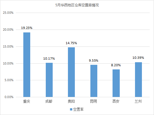 全國30個城市倉庫平均空置率為9.64%,環比下降1.3%。其中,華西、華中地區倉庫空置率高于華東、華北、華南。相較4月,華南、華中、華北、華西地區倉庫空置率有所下降,降幅分別為3.62%(華南)、2.71%(華中)、1.31%(華北)、0.29%(華西);華東地區倉庫空置率環比上漲0.19%。