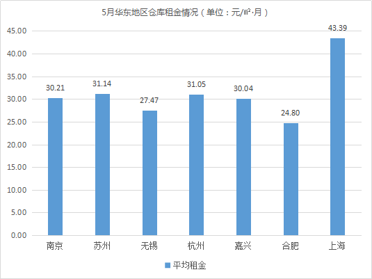 倉庫平均租金最低的城市為石家莊、南昌,均低于20元/㎡·月。相較4月,石家莊倉庫平均租金波動不大,市場平穩;南昌部分第三方空置倉庫業主加大招商優惠力度,使該地倉庫平均租金有所下降,降幅為2.26%。